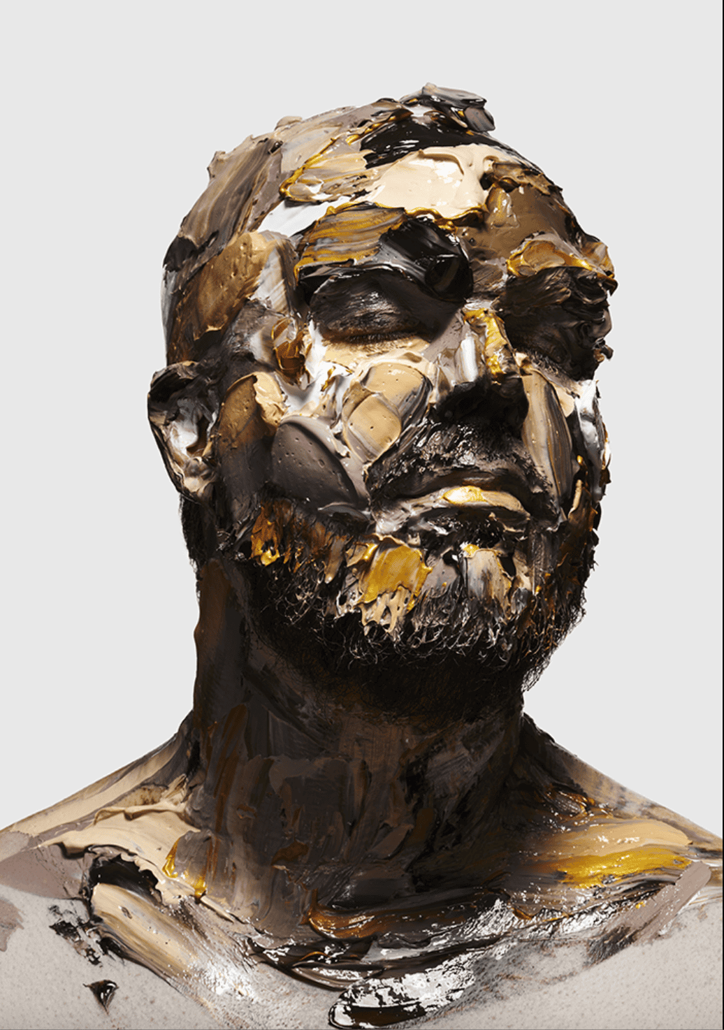 Bang by Lorraine van Wyk is a fine art photograph that invites viewers into a quieter, more intimate expression of masculinity. A bearded man tilts his head, eyes gently closed, as if caught in a moment of vulnerability. Cloaked in warm golds and soft beige, with subtle touches of charcoal textured impasto paint – thickly layered to evoke movement and depth – the subject radiates strength tempered with softness. Van Wyk’s use of colour draws inspiration from Kintsugi, the Japanese tradition of mending broken pottery with gold, suggesting that fragility can become part of one’s strength and story.