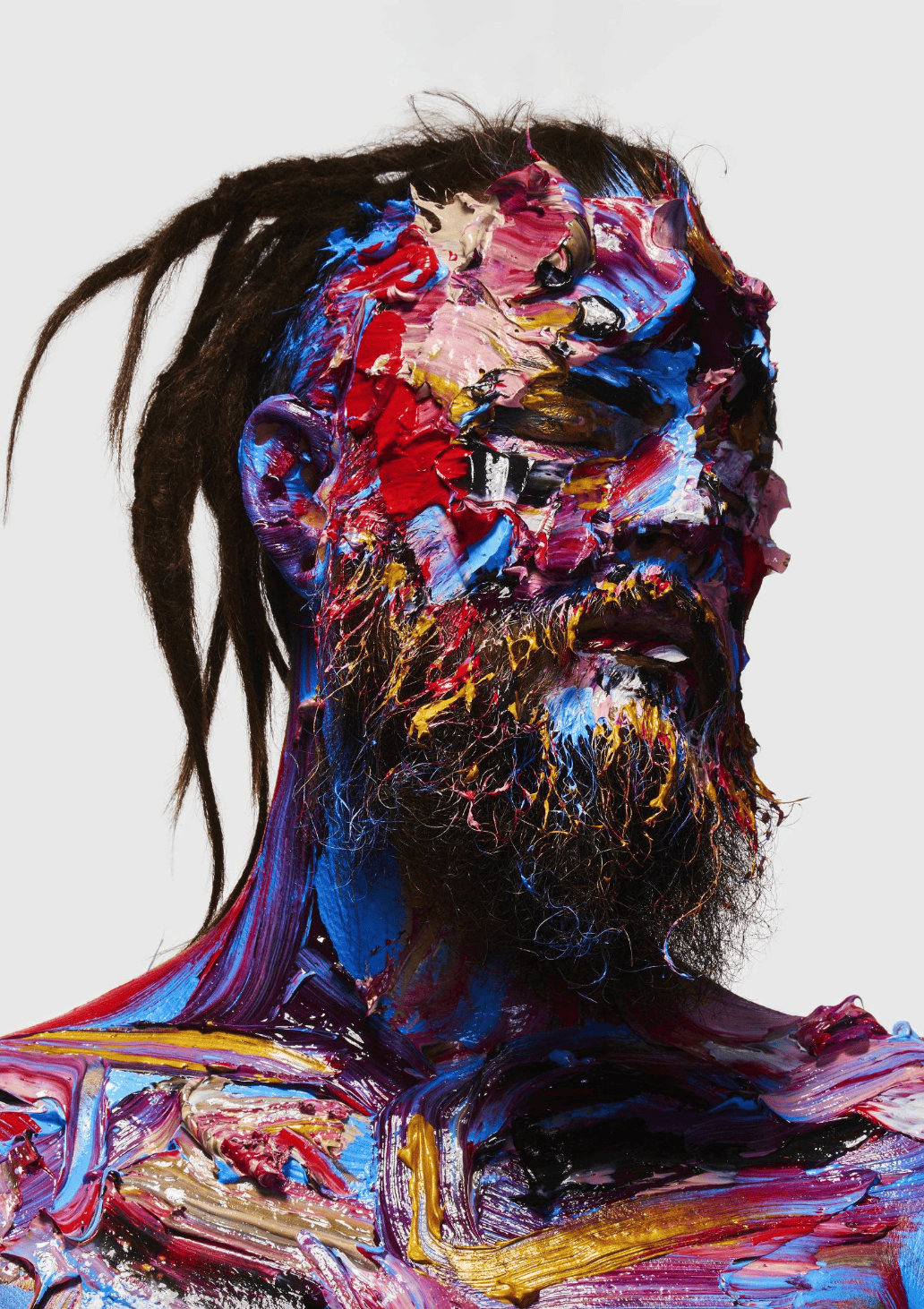 Space by Lorraine van Wyk is a striking fine art photography portrait that captures masculine creativity in unconventional and expressive form. The piece features a male figure set against a white backdrop, his face framed by the bold spikes of his dreadlocked hair. The model is painted in rich impasto (a technique where thick layers of paint are built up for added texture) and then photographed. The textured paint almost seems to rise from the surface, bringing a sculptural quality to the work. Reds, blues, purples and pinks are splashed with flashes of gold, creating a sense of movement and spontaneity that feels both powerful and playful.
